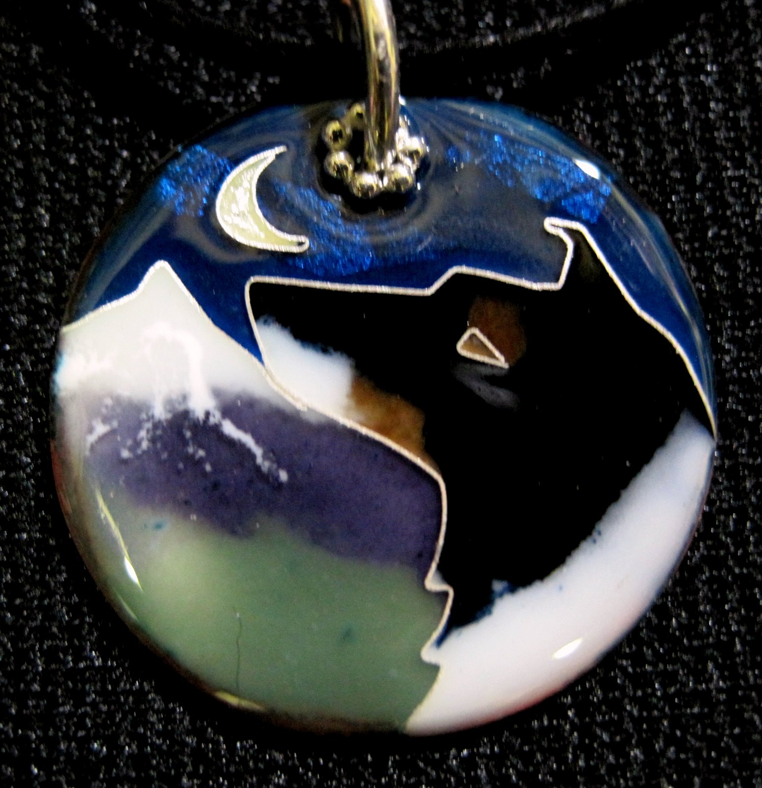 These original cloisonne designs were drawn with flattened silver wire on a surface of enameled copper. Finely ground glass pigments were then mixed with water and applied to that surface and fused in a kiln at about 1400 f. There is a minimum of 8 separate firings per piece. Each one is then ground flat, re-fired and hand finished. Ear wires and findings are sterling silver.